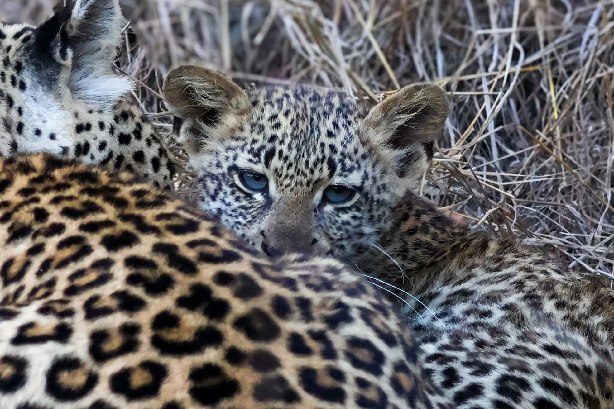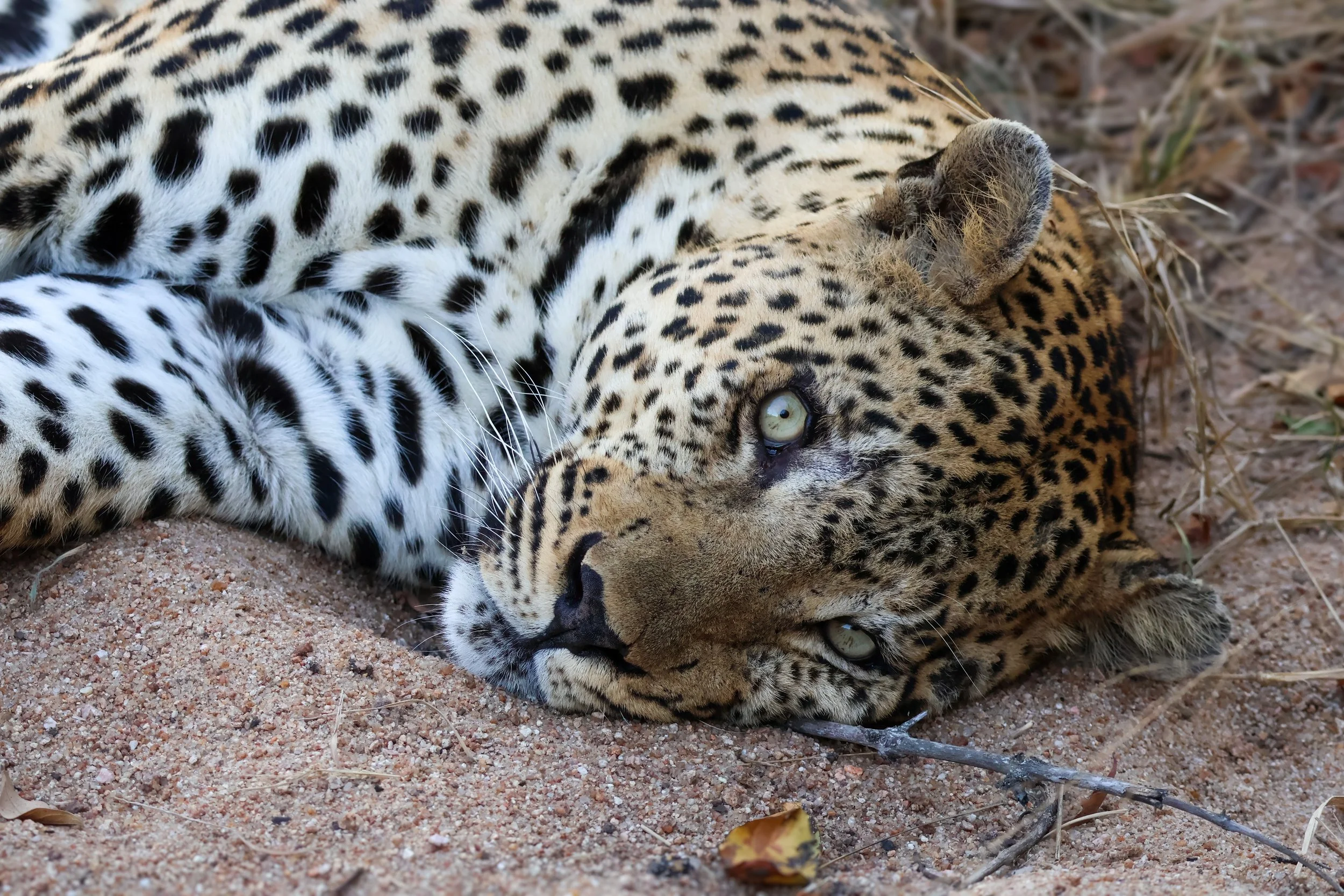 This was a particularly special sighting as we had uncharacteristically been struggling a bit with our leopard sightings (we usually see them everywhere even on my university campus once in an “only in Africa” moment). It took a trip to the Sabi Sands where these big cats seem to be around every corner to finally enjoy some close-up extended sightings of very relaxed leopards. And Tiyani’s stunning blue-eyed cub was the star of the show. Whilst looking for her our guide had informed us that her sibling had disappeared and had probably fallen prey to hyenas unfortunately, as Tiyani called and called for her lost cub. We watched a video of her calling and it was honestly heart wrenching. We found her and her remaining cub in a riverbed on a fresh winter’s morning with a hyena ever watchful nearby. The adorable interactions between Tiyani and her cub were bucket list moments and after photographing the cub’s gorgeous blue eyes she will forever be remembered for me as the leopard that got me into photography. We circled back at the end of our morning drive to find them at a waterhole in a more playful mood. The cub even ended up underneath both the vehicles at the sighting. We finally left them as they were meandering up the riverbed towards Simbambili Game Lodge where Tiyani has always given birth to all her litters and is “home” to her too.